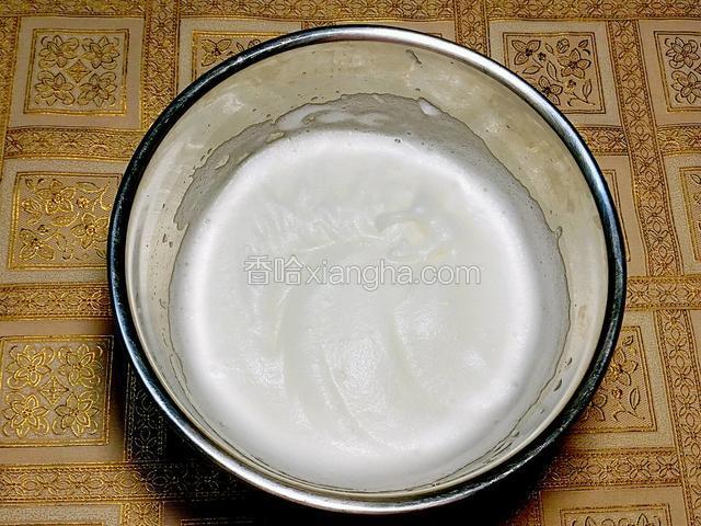 6.打至出現濃密的細泡,第二次加入1/3的糖