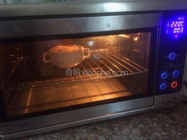 5.取一可以放进烤箱加热的双耳烤盘,将米饭均匀铺在盘子底部,用勺子按压紧实点。