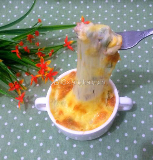6.取适量的马苏里拉芝士撒在米饭上,喜欢吃奶酪丝的可以根据个人喜好多放点,这样拉的丝也较多较长。