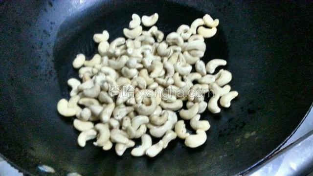 3.待过烧热,转小火,在锅中放入适量的油,倒入生腰果