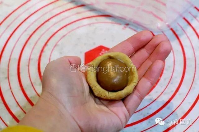 6.酥皮面团和麻薯团分小剂切好滚圆,麻薯面团约17克一个,酥皮面团约23克一个。