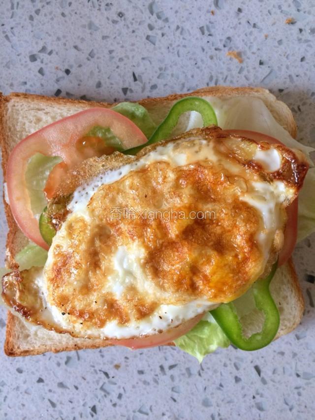 6.加个煎蛋,上面可以铺上西生菜,中间盖上一层吐司片,再抹一层金枪鱼沙拉酱