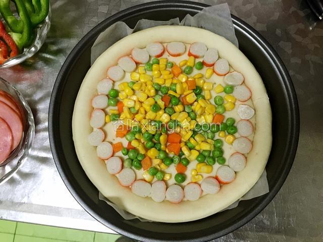 1.准备食材,披萨饼我用的现成的,大家会做的可以直接做,蟹肉棒切片,火腿切片,彩椒切片