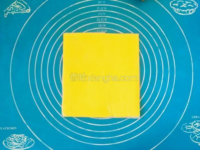 18.重复十七十八的步骤,如此3次。每次擀的时候要加少许面铺,即为三次三折。丹麦面团就做好了。