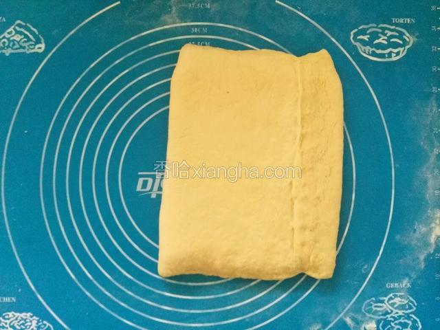 17.再次翻面,将面片三折。包保鲜膜放入冰箱松弛20分钟