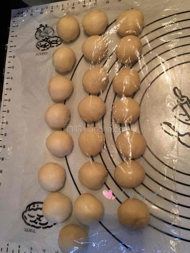 3.把440克豆沙称好,每个20克分22个,将豆沙搓圆压扁,豆沙片上放蛋黄,切口朝下把它包起来,包好后蛋黄切口朝上放一旁待用。
