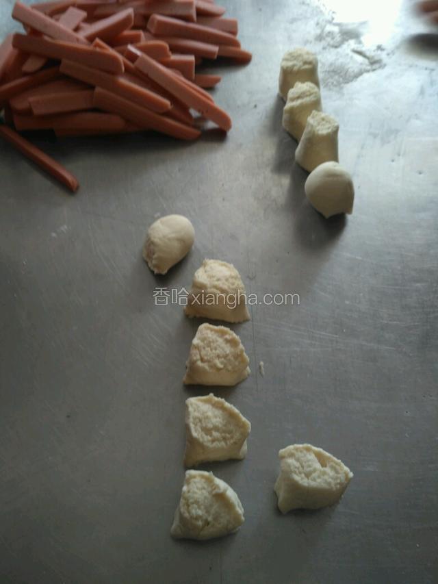 5.下剂子,搓条然后绕在火腿肠上。三圈四圈都可以,头尾收进面里。