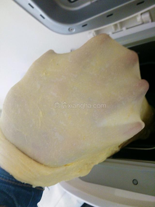 4.启动面包机揉面20分钟,达到扩展阶段,能拉出厚膜。