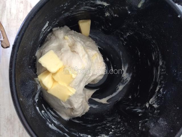 3.中种面团发酵好后,把主面团除黄油外按照先液体后固体的顺序放进和面机,然后将发酵好的中种面团撕成小块放入和面机里,中种面团较粘不好撕,手上沾点色拉油就好了,启动和面机揉10分钟