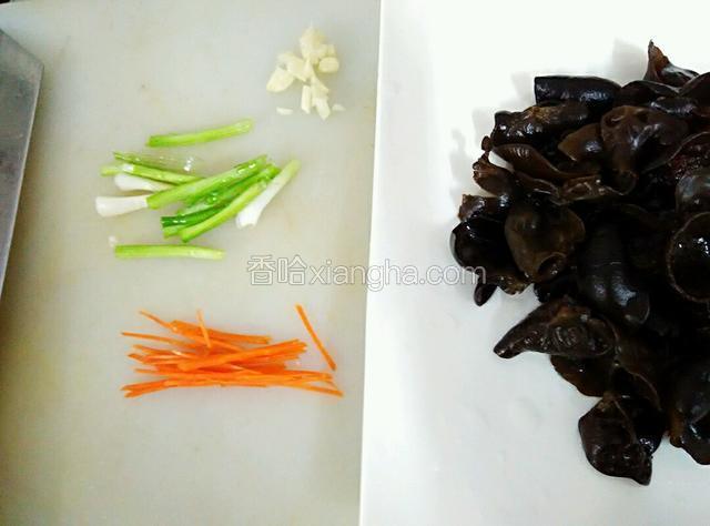 1.先准备好材料,木耳、葱白、大蒜、红萝卜丝