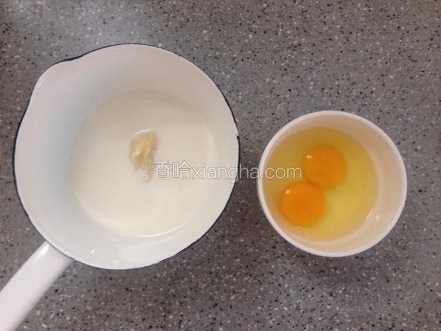 5.将奶锅小火加热,注意不停搅拌,直到白砂糖完全融化离火冷却,鸡蛋打散,将牛奶缓缓倒入蛋液里,搅拌均匀