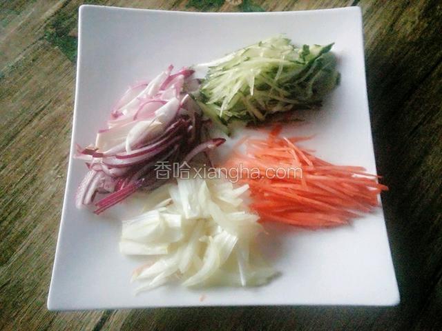 2.洋葱、胡萝卜、黄瓜分别切丝