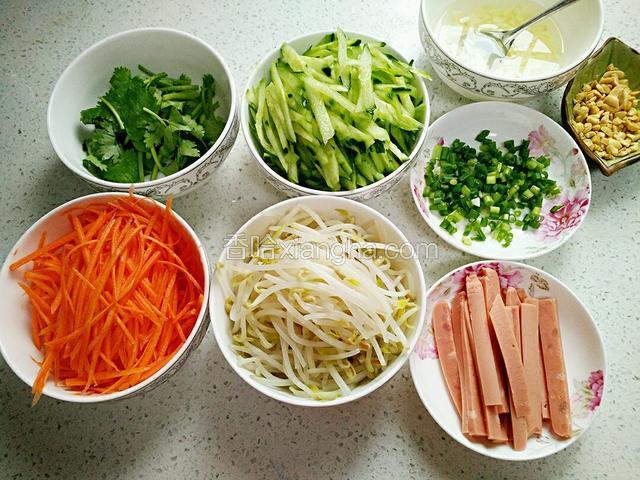 2.绿豆芽去须、洗净、火腿肠、脱皮花生。