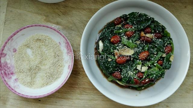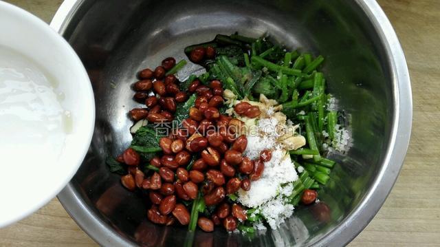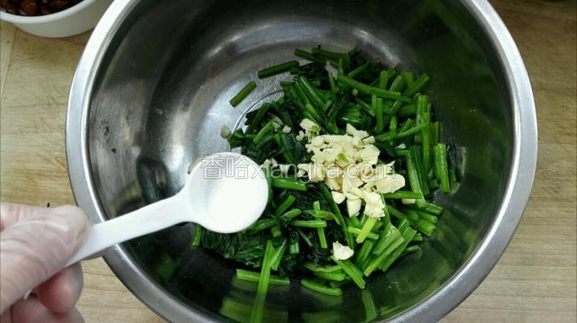 5.把菠菜放入盆中加入蒜末和盐