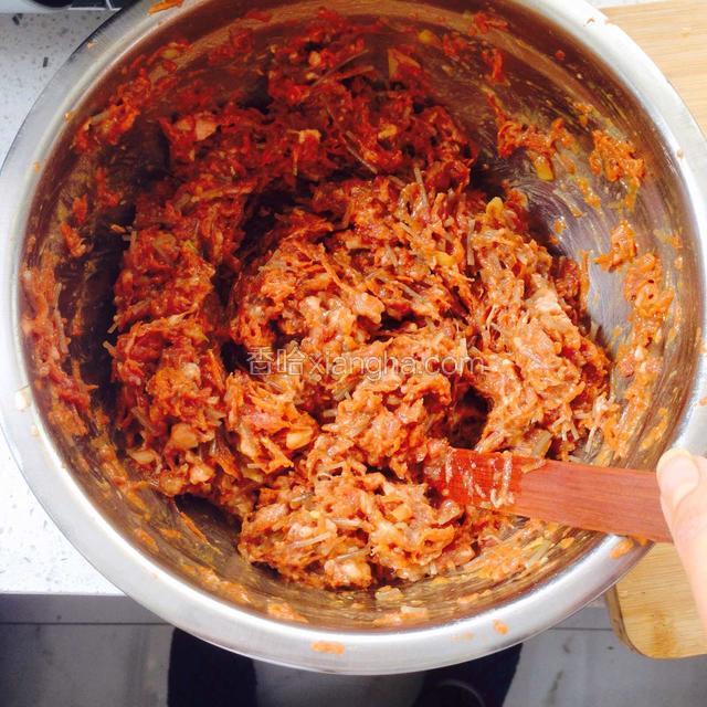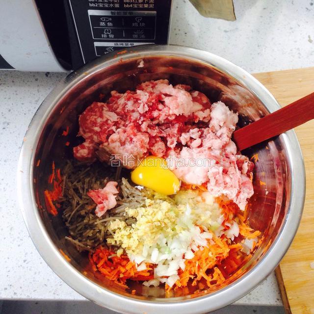 3.猪肉,胡萝卜,粉丝,葱姜全部放入一个容器中,打一个鸡蛋