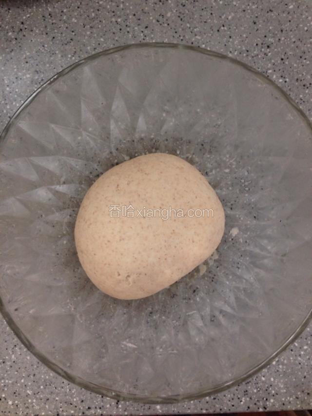 2.倒入全麦面粉,用筷子搅匀后用手揉成光滑的面团,密封好发酵至2倍大