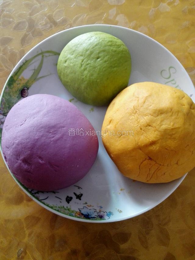 2.然后把南瓜、紫薯、蒸熟捏成泥、把菠菜榨汁和面。