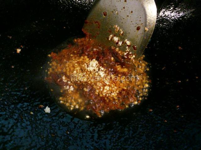 5.锅中热油,加一小把花椒粒和2个八角小火炒出香味后捞出丢弃,留油。然后加入一大勺豆瓣酱和剁好的蒜蓉小火煸炒出红油。