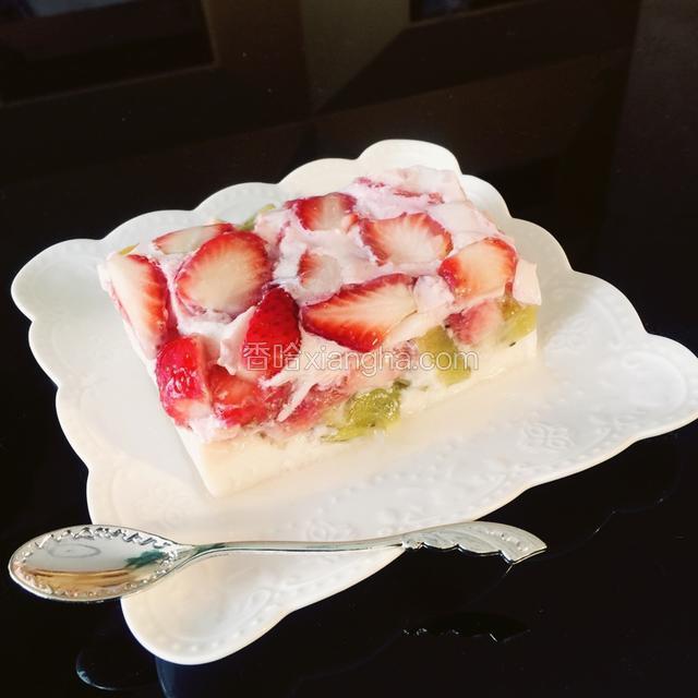 6.水果摆放一定要考虑切割是的问题,因为水果偏硬,羹偏软,如果水果造型摆放过于混乱切的时候羹体就不会太完整(看,我这块就明显是个失败的例子?)。