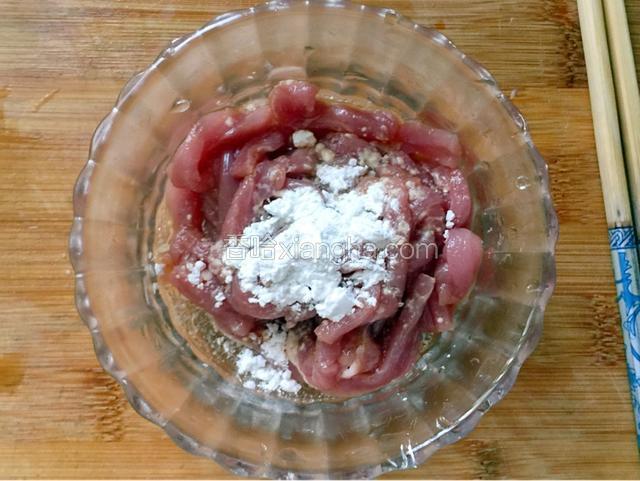 1.里脊肉顺着纹理切丝,加生抽和淀粉腌制