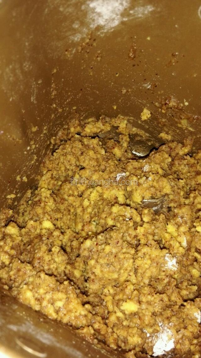 3.将红糖化水倒入大枣碎中放入料理机打碎成泥,核桃仁打成粉。