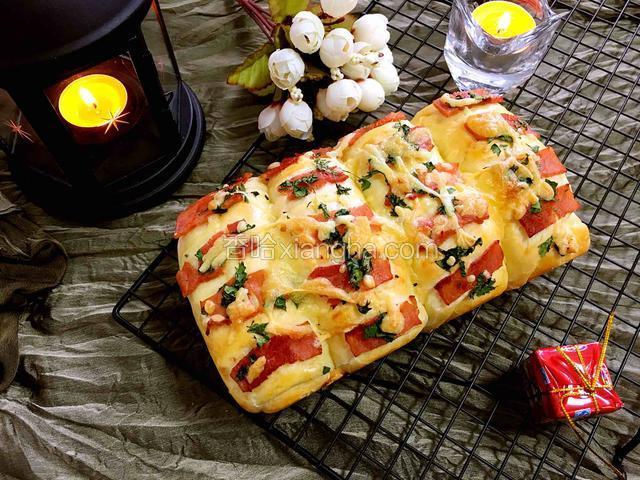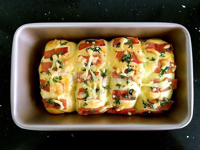 1.除培根和奶酪外,先放入液体部分,糖和盐对角位置放入,在放入粉类,酵母埋入面粉中。倒入橄榄油,设置两个和面程序。