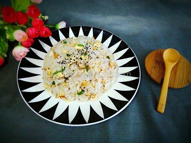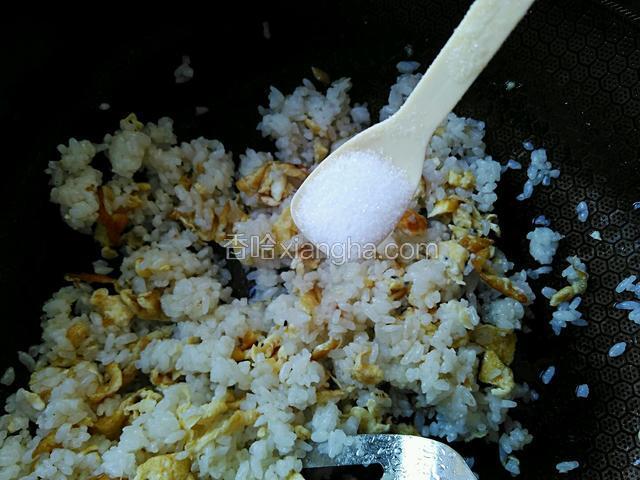 4.冷藏好的米饭取出,用饭铲拍松散。鸡蛋打散,加三茶勺的清水,再加一点食盐。加清水炒出的蛋会比较嫩,且出蛋量较多,加食盐蛋会比较有味道。我在鸡蛋里加了点黑芝麻,这样炒出来味道会更香。