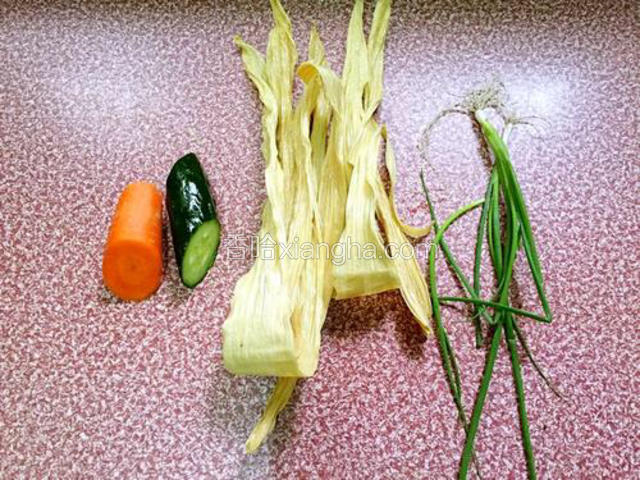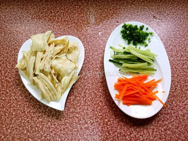 3.泡软的腐竹洗净切段,青瓜、胡萝卜切成丝,葱切葱花