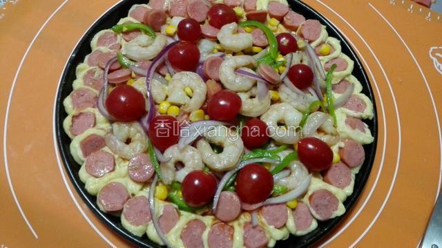 2.青椒切丝,小番茄对半切,葱头切片,玉米,火腿备好!