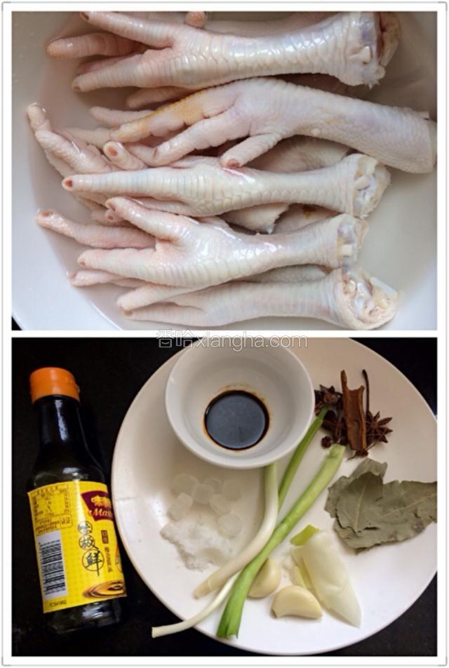2.锅里倒入热水放入鸡爪花椒姜煮10~15分钟,去除鸡爪的腥味和赃物