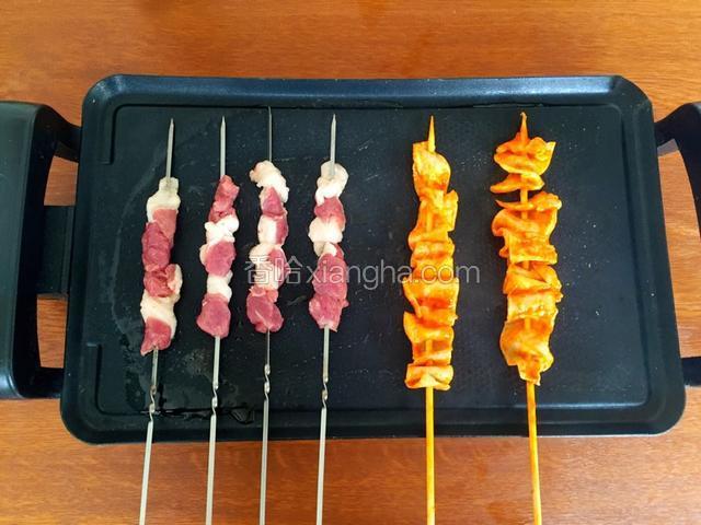 3.将电烤盘预热,选择中火,涂抹食用油,油热放入羊肉串烤制