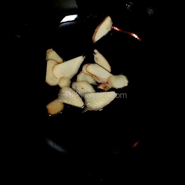 3.锅内倒入适量油,烧至7成热放入生姜片炝锅。