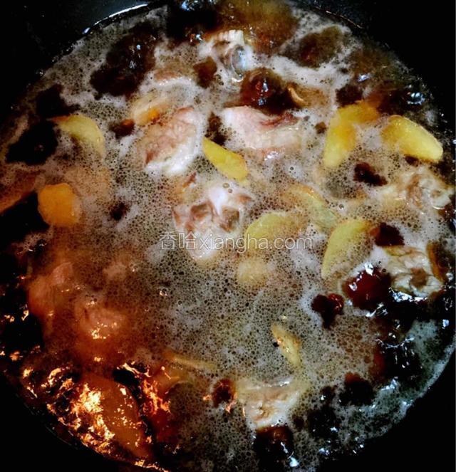 5.锅内加入适量清水,料酒,八角,少许老抽,冰糖,和排骨一起煮开后,调小火焖煮30分钟。
