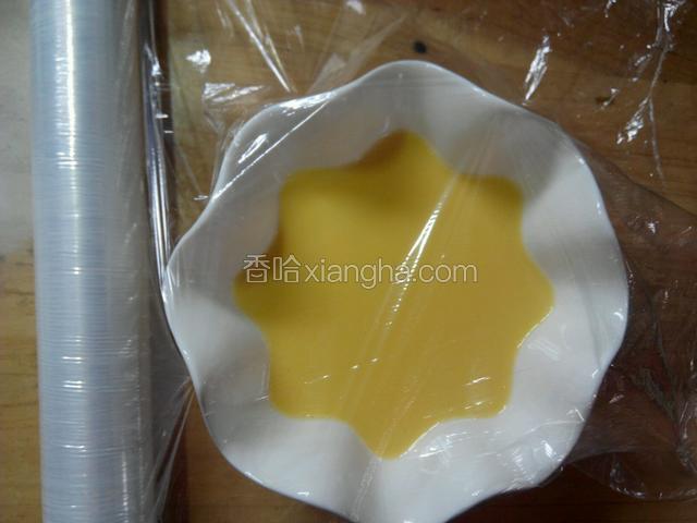 6.过滤好的牛奶蛋液慢慢倒入碗中。然后碗表面蒙上保鲜膜。