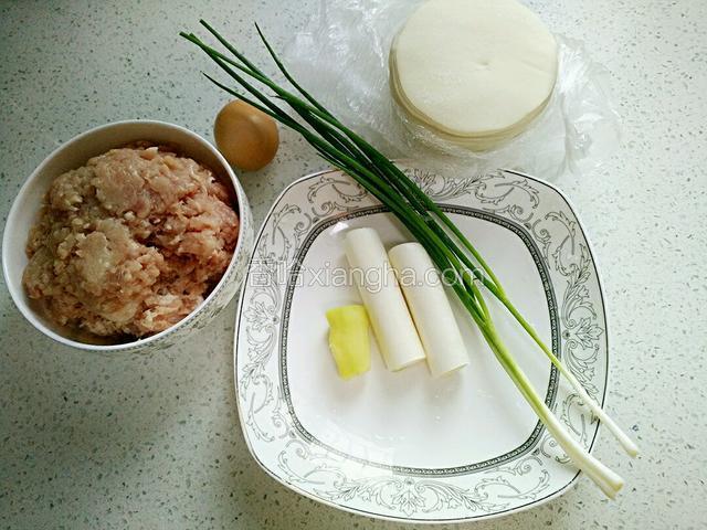1.后腿肉馅提前剁好,大葱段、香葱、姜洗净,鸡蛋、饺子皮。