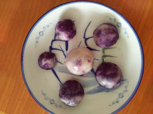 5.因为我准备的紫薯有点多所以干脆糯米团也和了紫薯,做成炫彩紫薯糯米团,看着也很好看