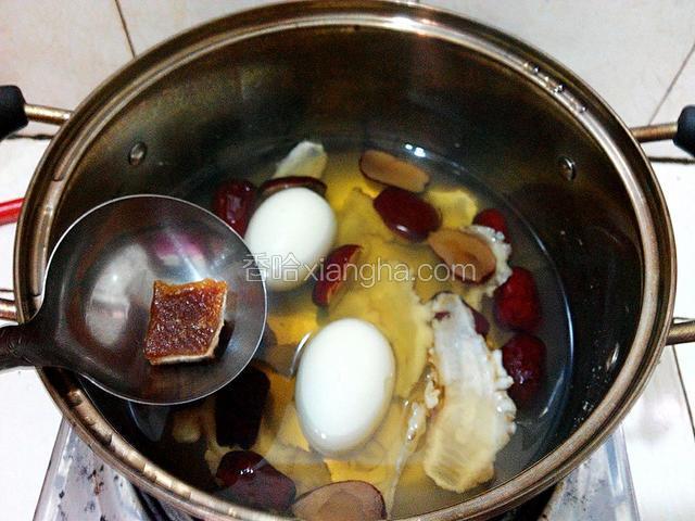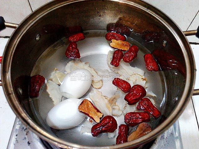 4.把当归、红枣、鸡蛋、放入锅内、加入适量清水、盖上锅盖