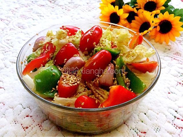 6.白菜叶用手撕成小块,小柿子、元葱、青红椒切成小块,放入盆中。