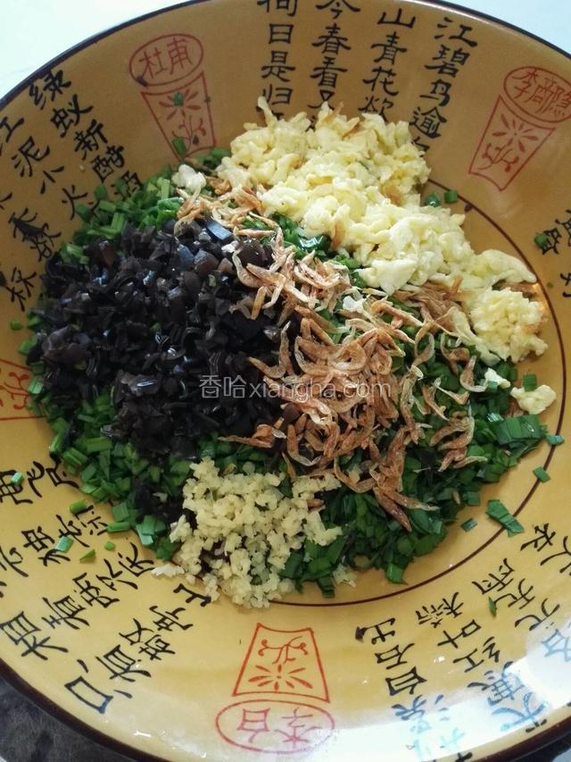6.在醒面的同时,开始准备馅料的调制,把所有的材料,切碎,混在一起