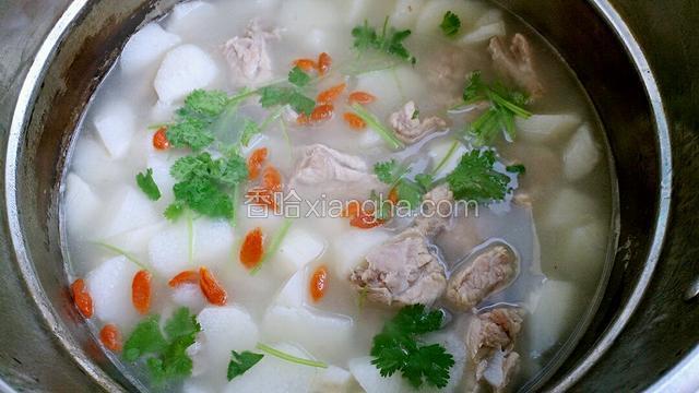 5.调入适量的盐和鸡精,再放入枸杞和香菜即可。