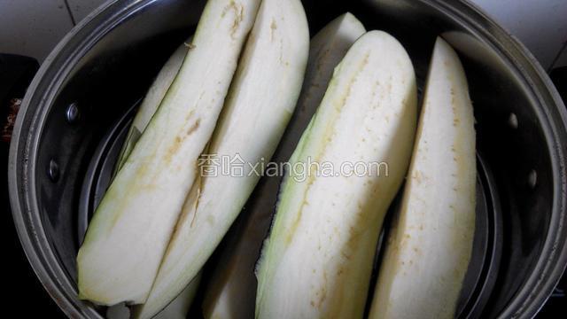 1.茄子洗净,一切4块,放蒸锅上蒸