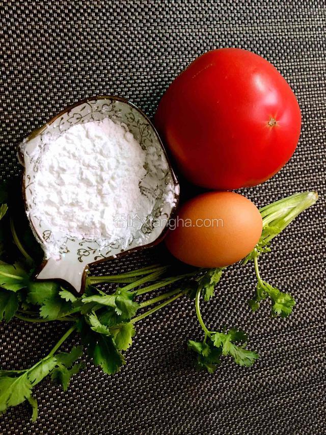 1.准备食材:番茄、鸡蛋、水淀粉、香菜……