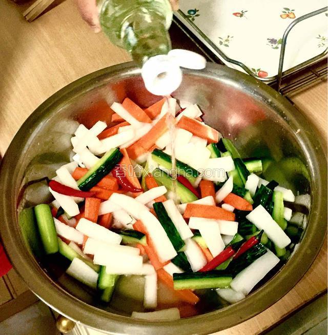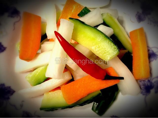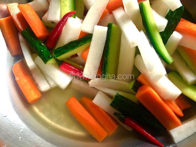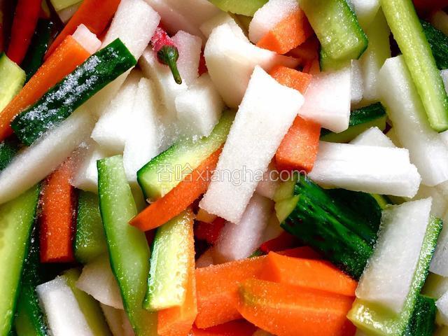 3.将白萝卜、胡萝卜和黄瓜分别切成大小相似的条形状,与新鲜的小红辣椒一起放入一个稍大些的容器内混合均匀。