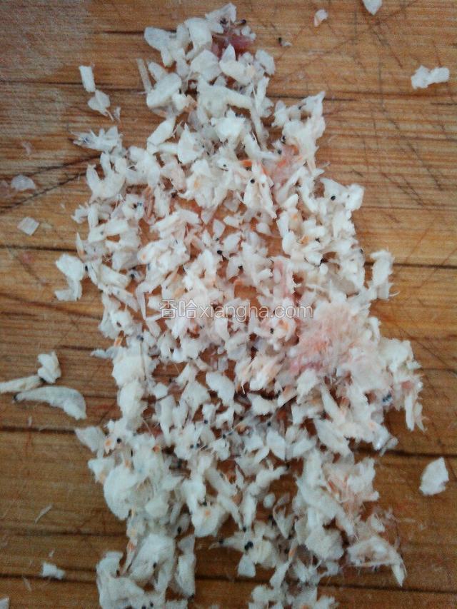 4.猪肉末和虾皮末放在一起,加入两勺水,半勺淀粉,盐,酱油,五香粉,起锅热油,加葱和花椒粒,油刚冒烟就关火,油倒在肉末上