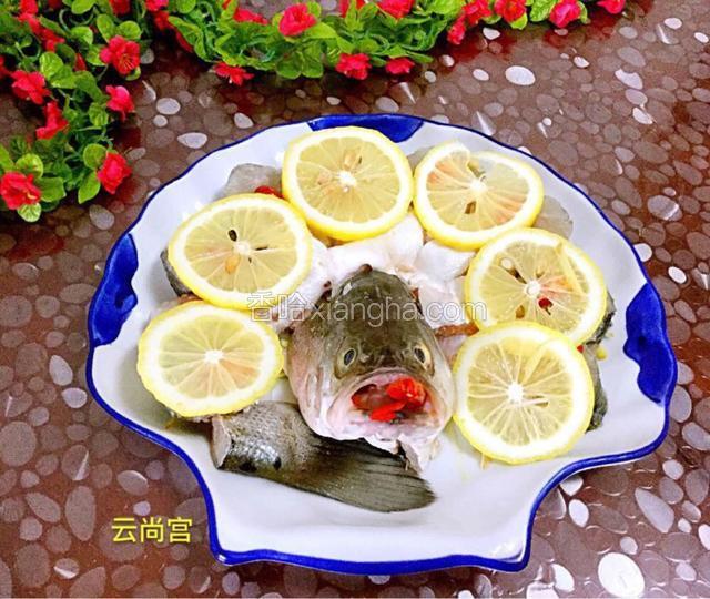 6.把切好的鱼摆放在葱姜丝上,鱼身要摆摊开造型。摆出孔雀开屏样子,鱼头放在前面摆在鱼身中间,鱼尾放在旁边。开屏鱼的造型就成了,鱼嘴里含上辣椒丝、身上摆上红辣椒粒。