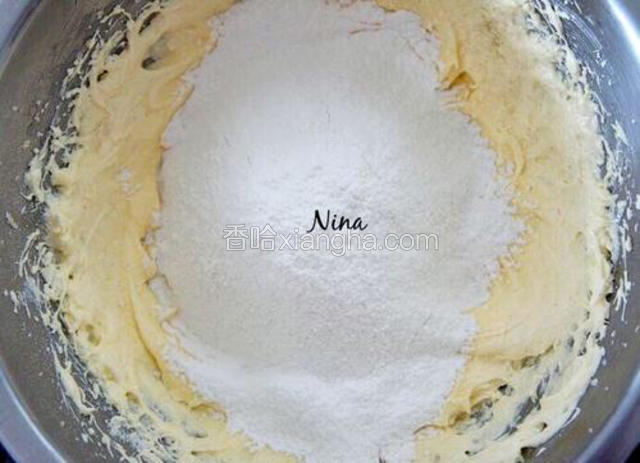 5.加入低筋面粉和泡打粉,用翻拌的手法搅拌均匀至无干粉状态即可。 提前预热烤箱180度。