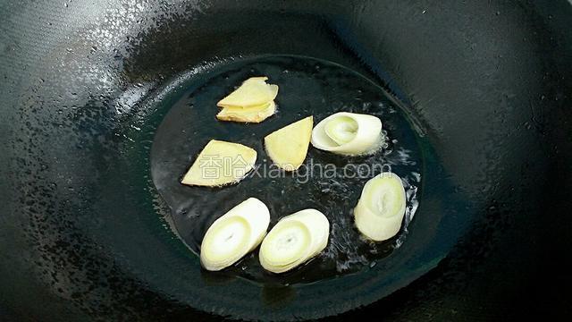 4.另起锅放适量油烧至五成热,放入大葱段和姜片爆香。