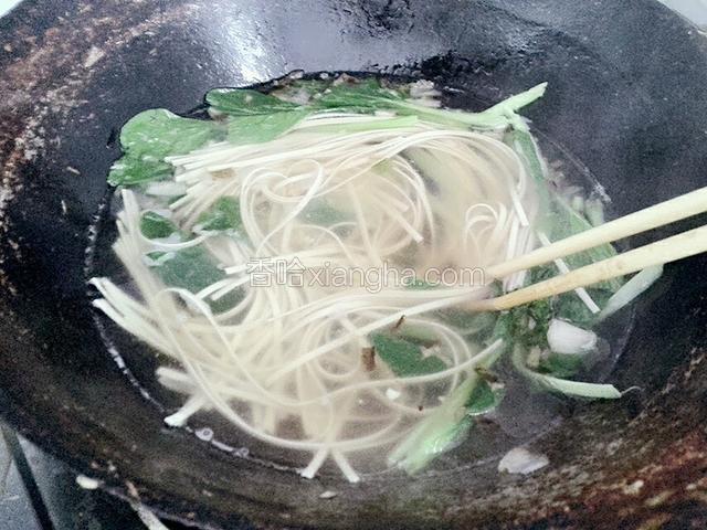 3.水开后,放入挂面,拿筷子挑开,放入盐,煮至挂面成熟,变软。