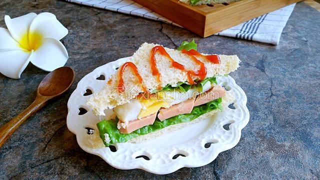6.火腿肠从中间切开,再切成片,放在生菜上面