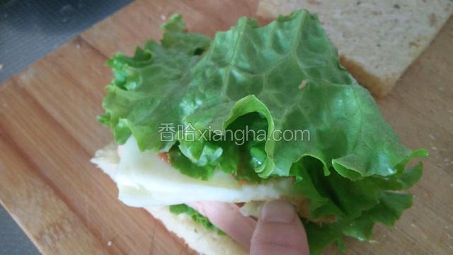 5.取出一片吐司片,有沙拉酱的一面朝上,盖上一半洗净的生菜